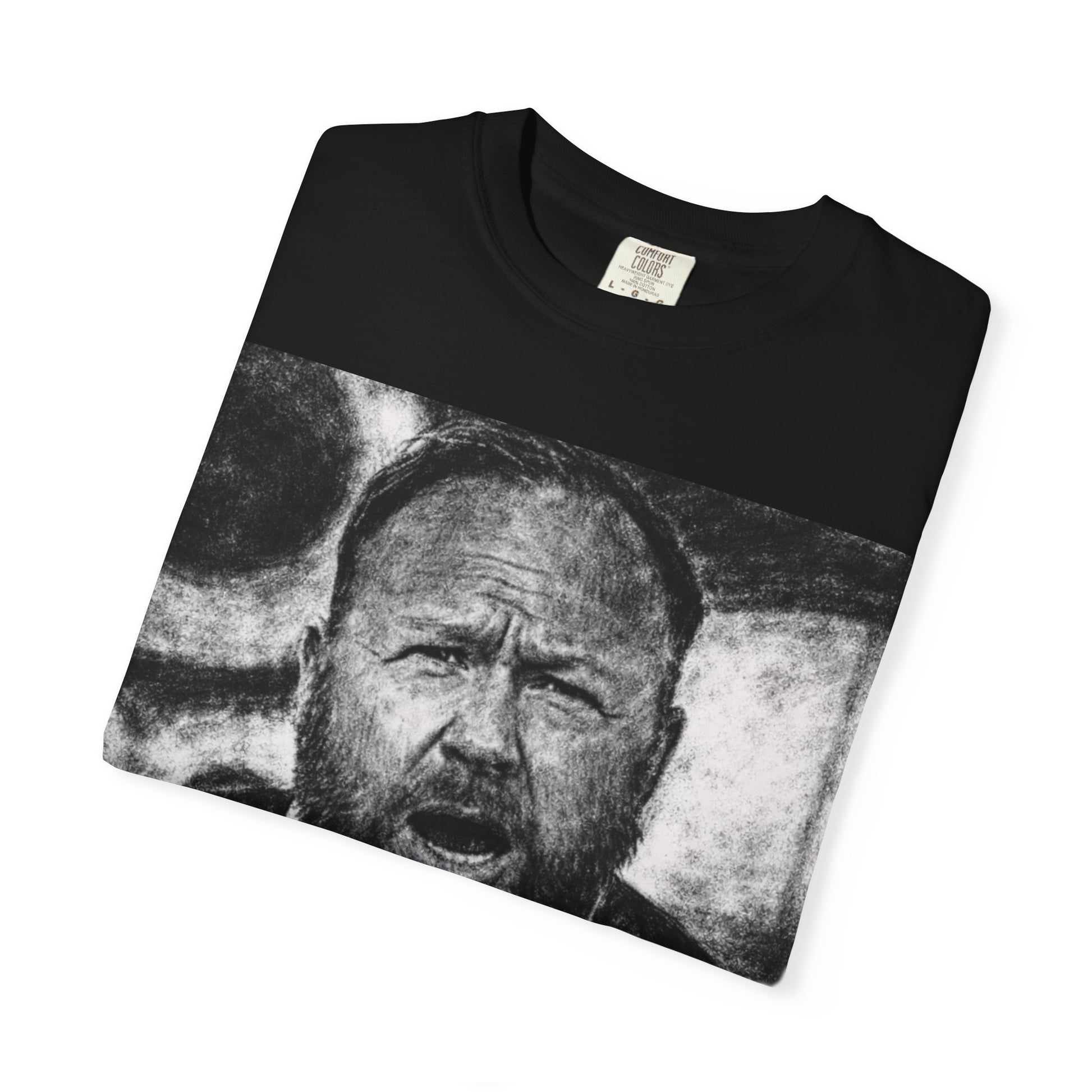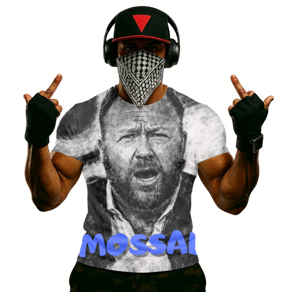 Alex Jones Graphic T-Shirt β Bold Mossad Text Over Grayscale Portrait, Political Statement Tee