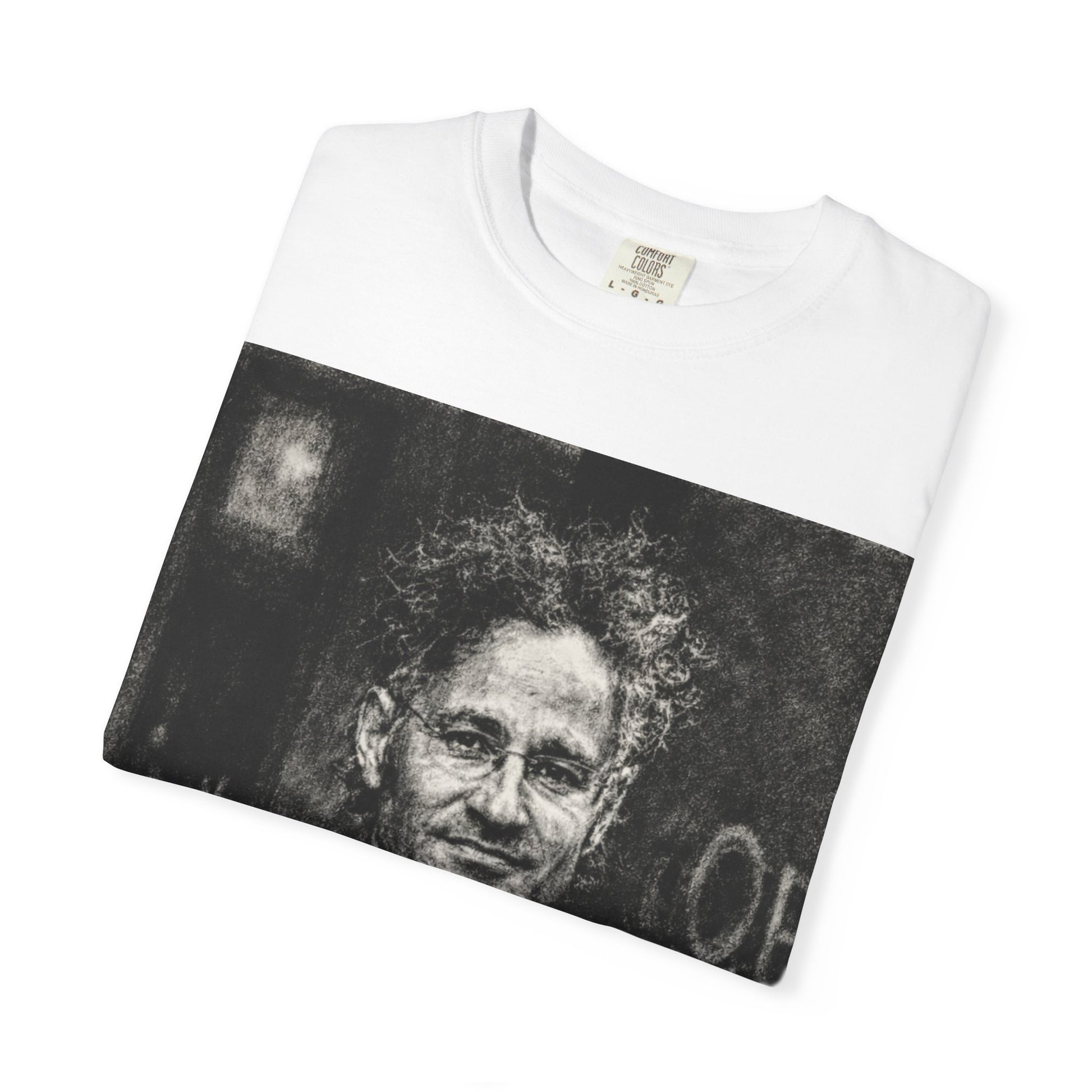 This garment-dyed tee feels lived-in from the first wear. The heavyweight 100% ring-spun cotton softens with each wash while the relaxed cut keeps movement easy β a dependable layer for days when you want to look thoughtful without trying. The front art sits like a worn poster: a high-contrast, grainy portrait above a bold blue wordmark. It reads like a statement youβve carried through late-night conversations, street walks, and coffee shop chapters. Wear it with faded jeans, an overshirt, or layered under a worn jacket; it settles into your rotation and ages with character.