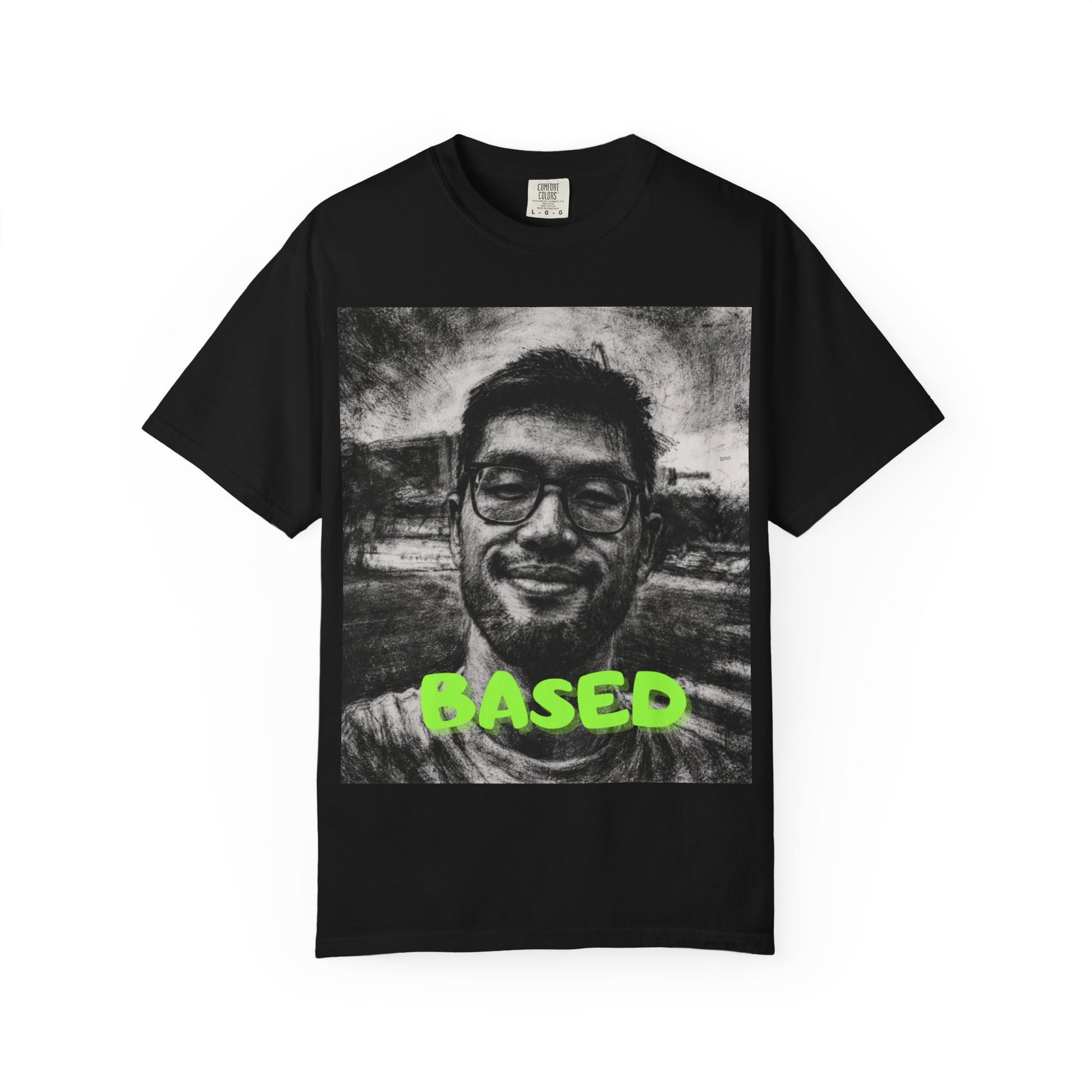 James LI Based Photo T-Shirt β Grayscale Portrait Tee with Neon "BASED" Text