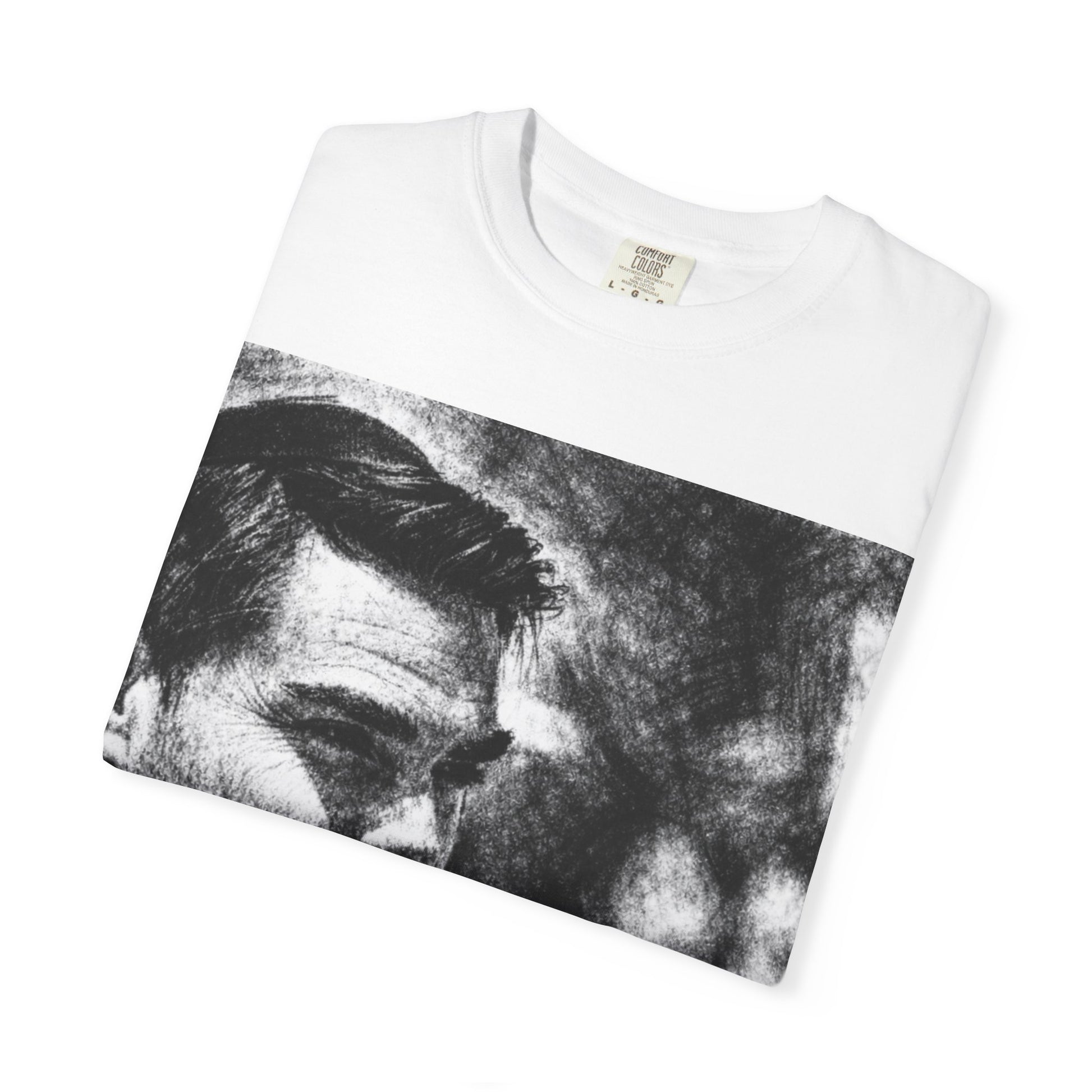 A heavyweight, garment-dyed tee that wears in like an old favorite. The relaxed silhouette and soft, post-dye texture invite long days outdoors or slow mornings at home. A bold, square front print in high-contrast black-and-white gives this shirt a gritty, documentary feel, while the small blue wordmark at the base adds a pop of color and attitude. Made from 100% ring-spun cotton with double-needle stitching and a tubular knit body, it sits comfortably across the shoulders and keeps its shape wash after wash. Wear it with worn denim and boots for a lived-in look, or layer it under a jacket when the evening cools down.