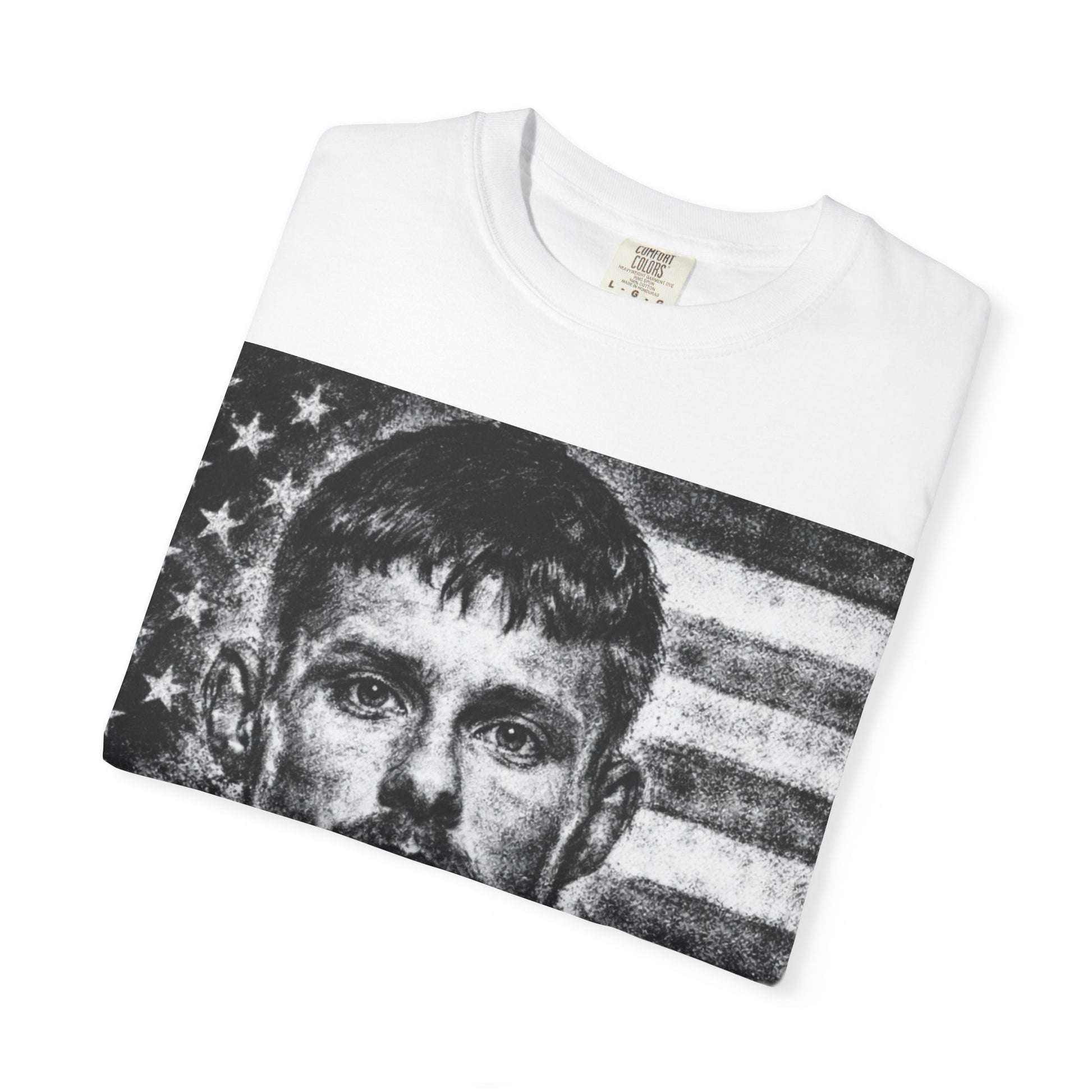 This relaxed-fit garment-dyed tee carries quiet confidence. The heavyweight 100% ring-spun cotton drapes with lived-in softness, and the bold front artwork β a high-contrast, gritty portrait set against a faded flag backdrop with neon-green lettering β gives the shirt a rebellious, street-ready edge. Wear it when you want your outfit to speak in short, clear sentences: durable, unapologetic, and comfortably broken-in. It layers easily under a denim jacket or stands alone at outdoor gatherings, late-night hangs, and casual weekend runs. The muted tones of the print play well with worn-in jeans and work boots, while the neon text adds a jolt that reads as intentional attitude rather than flash. Built to last with double-needle stitching and a tubular knit construction, this tee moves with you and softens with each wash without losing character.