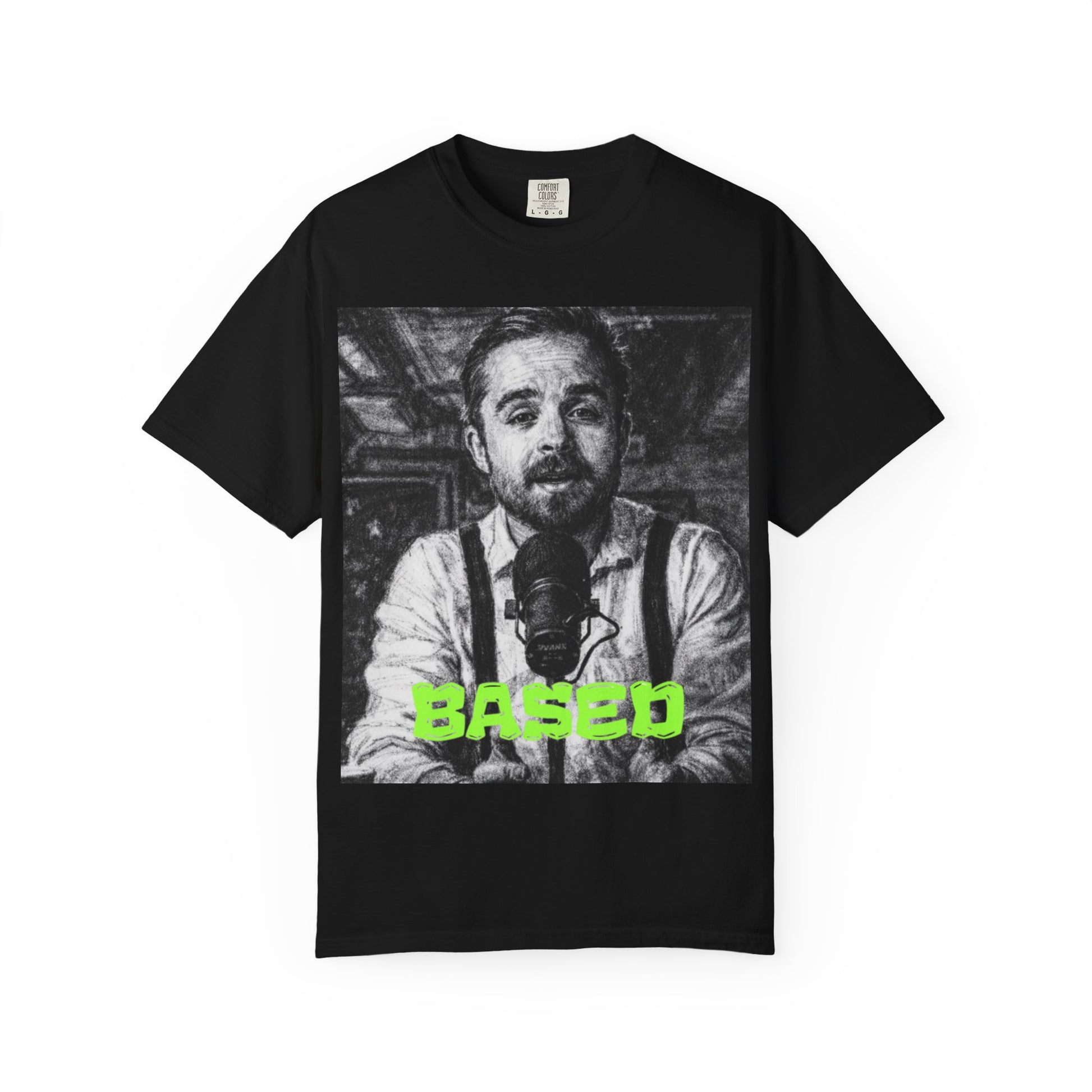 CoffeeZilla Based Portrait T-Shirt — Vintage Monochrome Photo Tee with Neon "BASED" Text