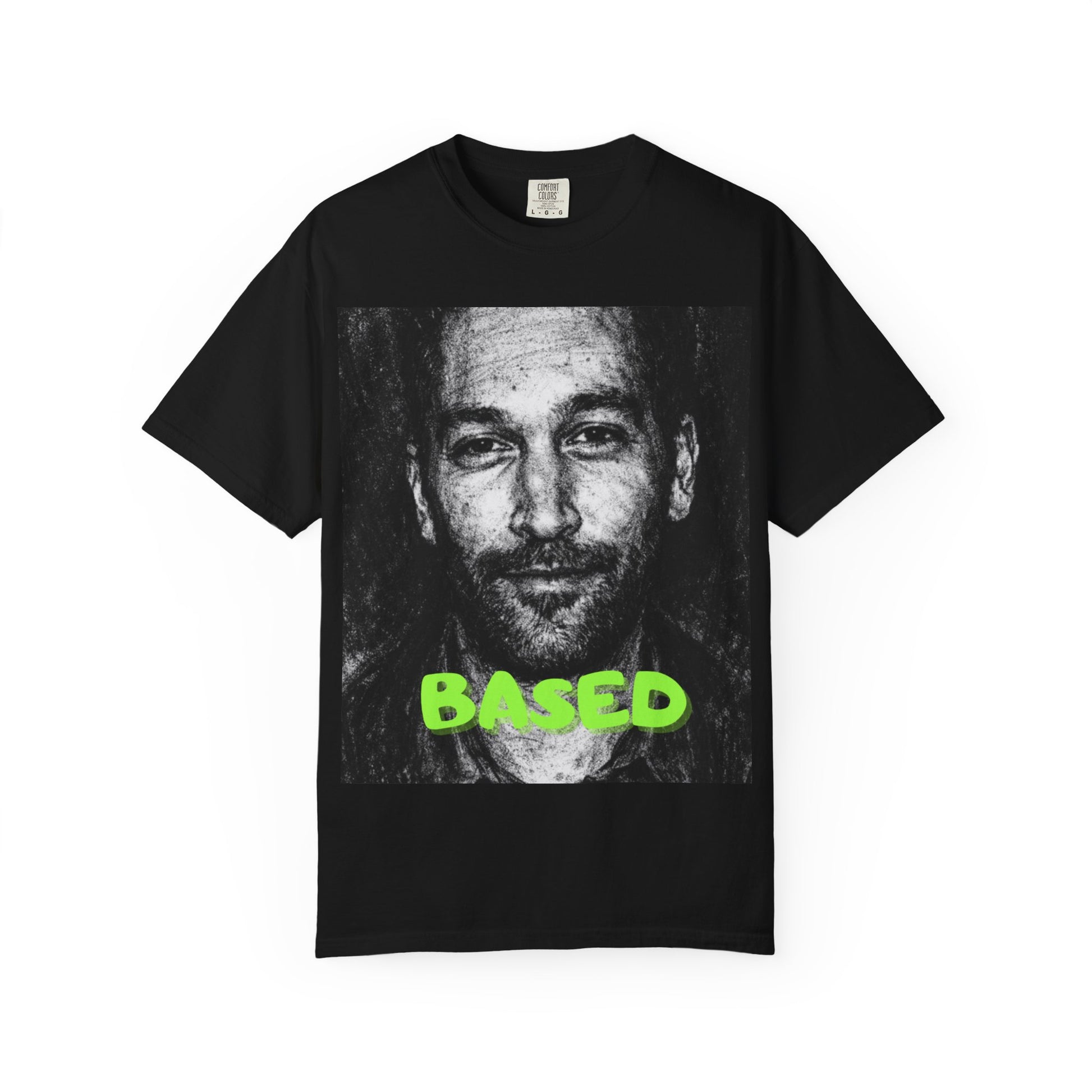 A heavyweight, garment-dyed tee that reads like a statement piece. The relaxed fit and soft, washed-in color give it a lived-in vibe β like a favorite record you grab on repeat. The front shows a high-contrast black-and-white portrait with a bold neon-green "BASED" across the bottom, giving the shirt a gritty, underground energy. Wear it to late-night shows, coffeehouse hangs, or while wandering the city; it layers easily under a worn denim jacket or stands out on its own. The ring-spun cotton and tubular knit make it comfortable all day, while the double-needle stitched seams keep it holding shape through repeated wears. This tee feels like an inside joke and an anthem at once: worn by people who value raw authenticity and low-key rebellion.