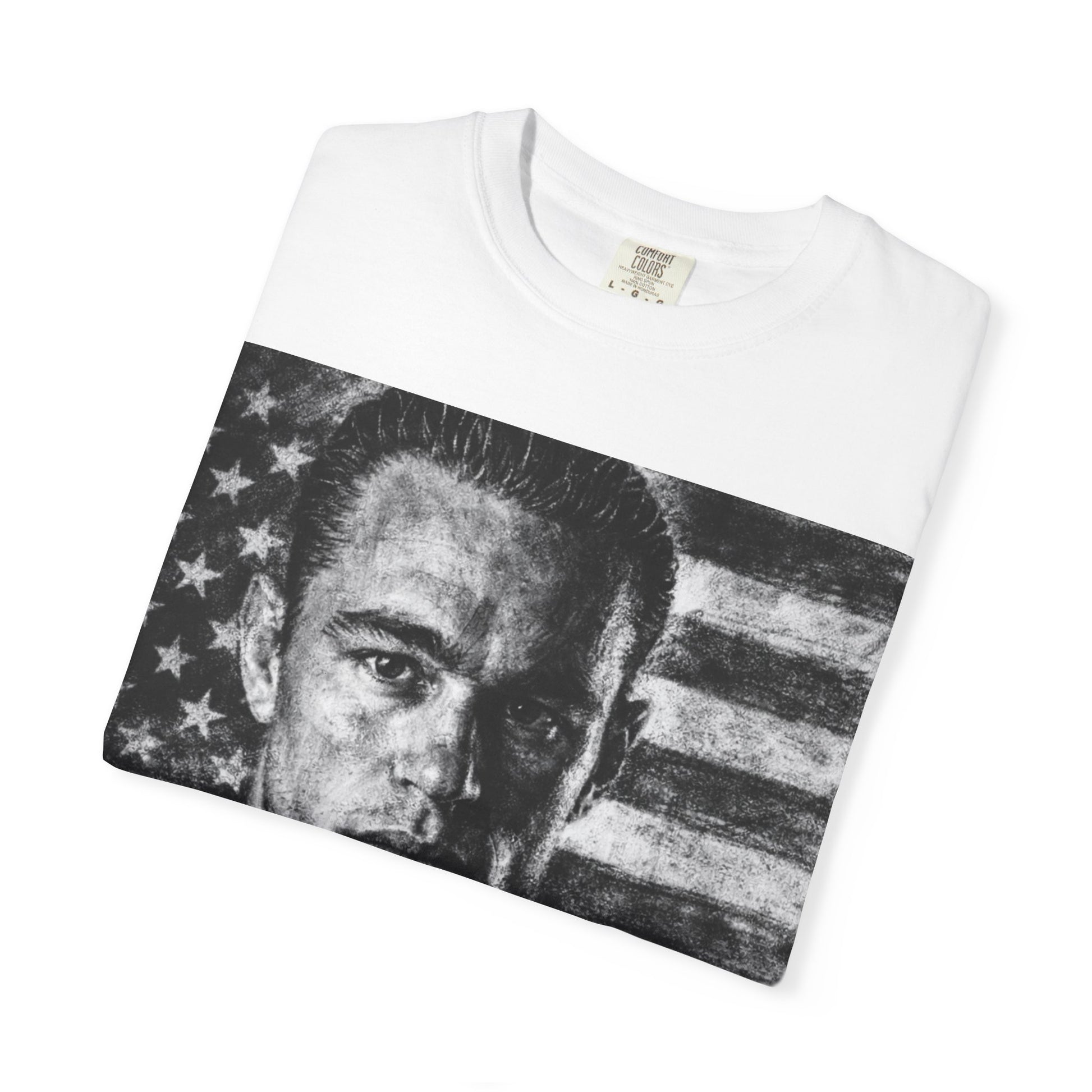 The design sits squarely in street and counterculture aesthetics; the stark black-and-white print contrasts with the vivid text to make a statement without shouting. Built from 100% ring-spun cotton and sewn with double-needle stitching, the shirt balances substantial weight with breathable comfort. Choose a darker color if you want the portrait to blend into a tonal look, or a light base to make the neon lettering pop.