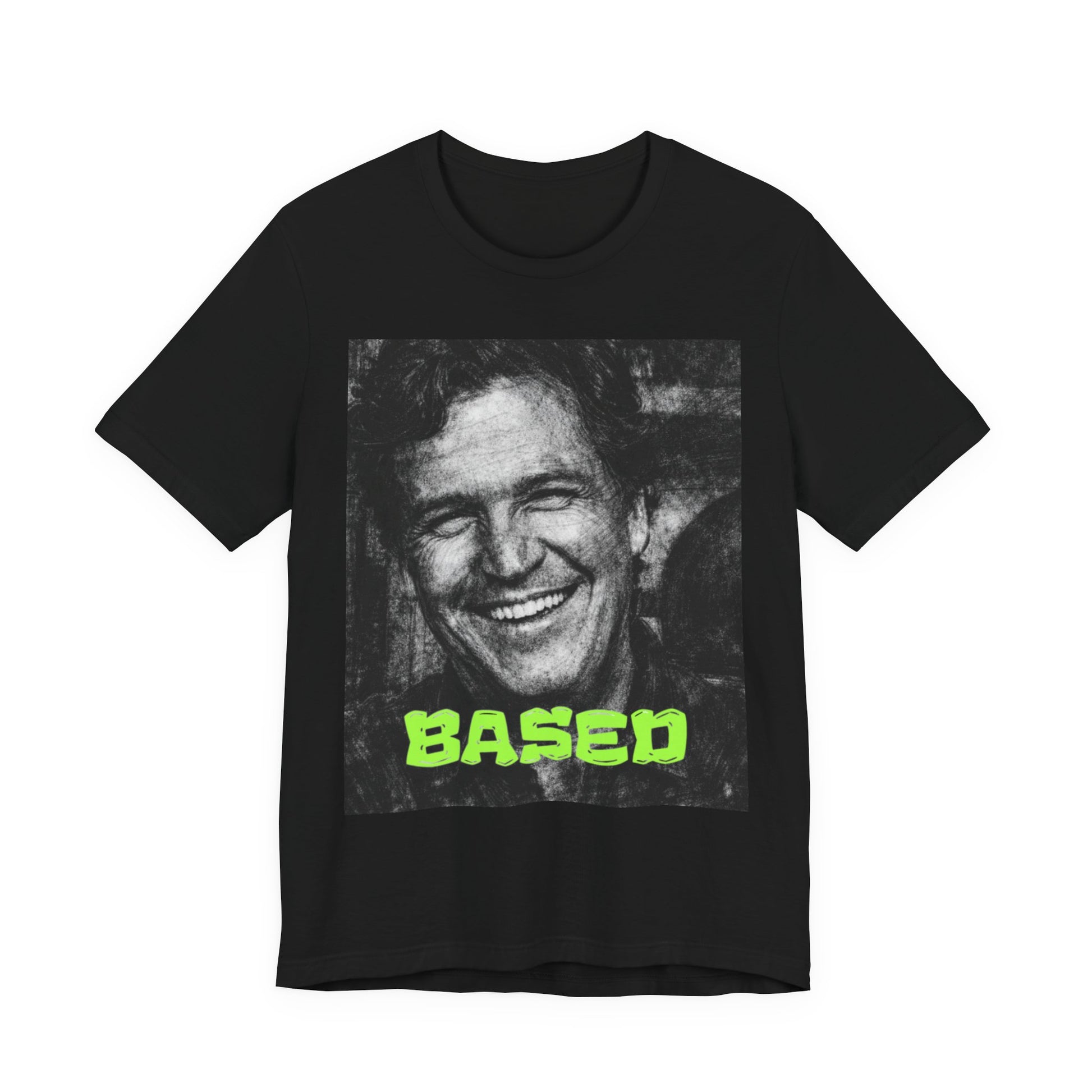 Tucker Carlson Based Graphic Tee — Neon "BASED" Retro Portrait T-Shirt